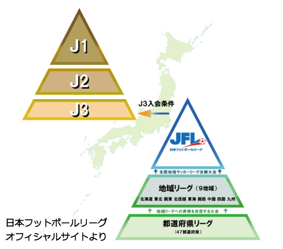 表示しているのはJ1リーグをトップとしたJリーグとJFLをトップとしたJFLリーグ それぞれのピラミッドになっています。